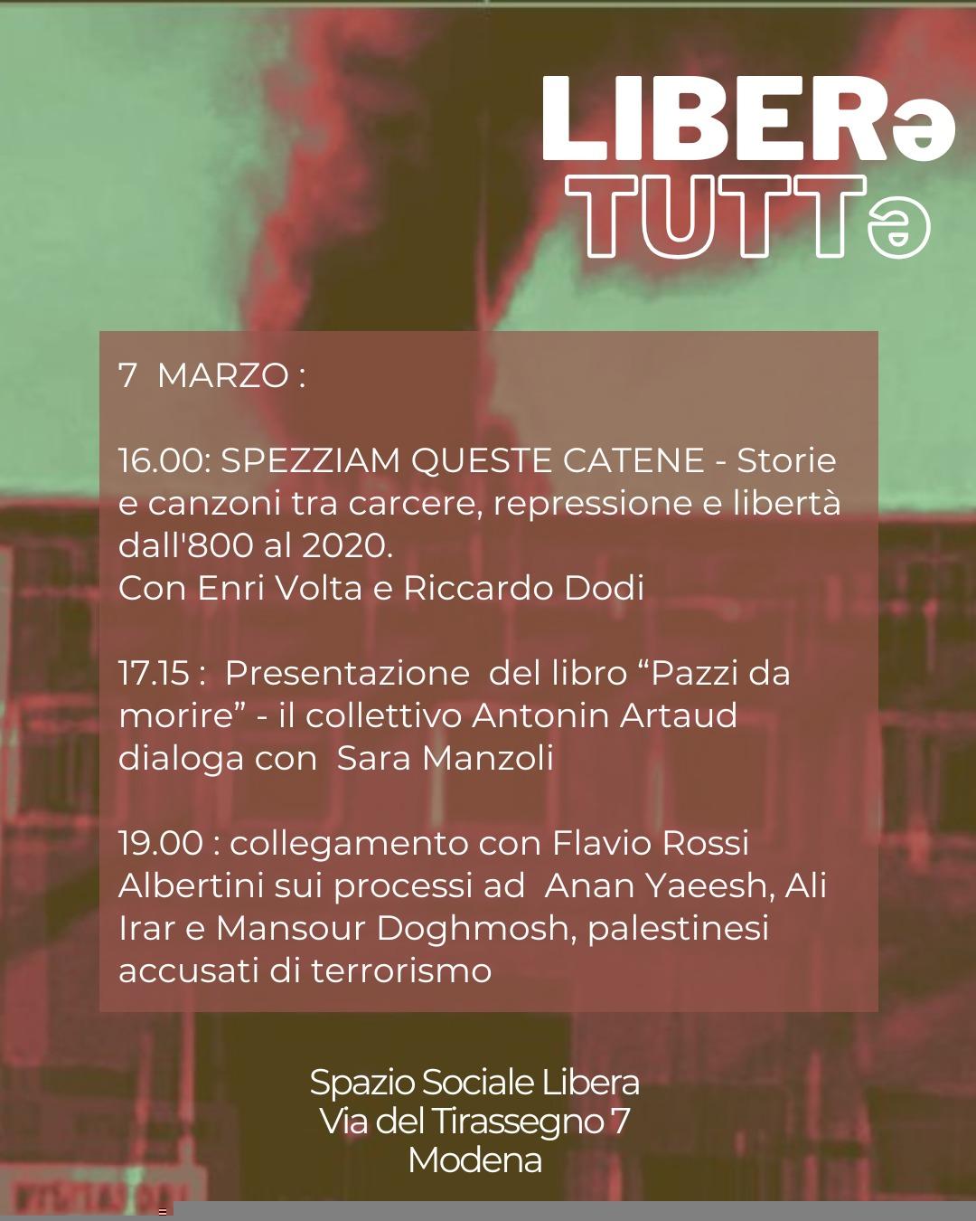 Nell’ambito della due giorni per ricordare la Strage del carcere Sant’Anna di Modena avvenuta l’8 marzo 2020 SABATO 7 MARZO 2026 c/o lo Spazio Sociale Libera in via del tirassegno 7 alle ore 17:15 presentazione di:
